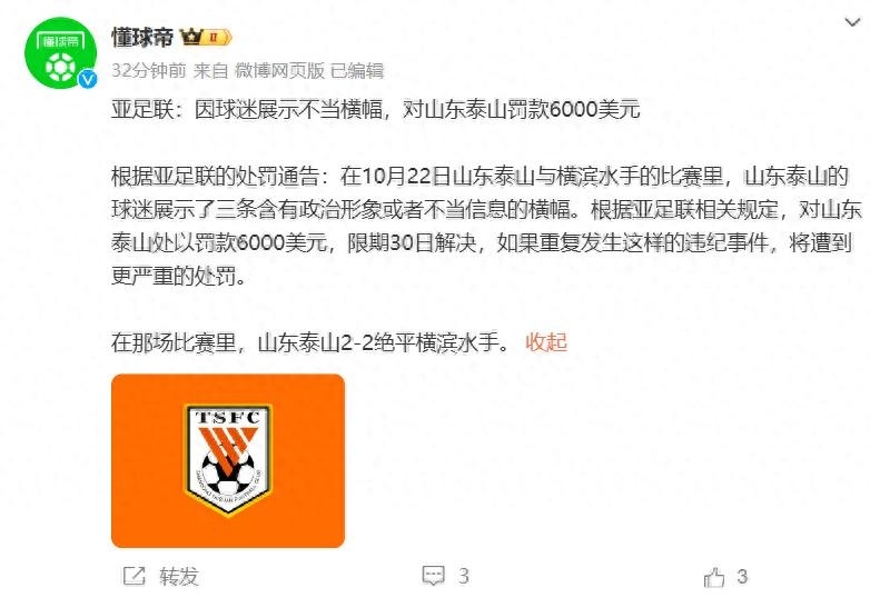 根据亚足联的处罚通告:在10月22日山东泰山与横滨水手的比赛里,山东泰山的球迷展示了三条含有政治形象或者不当信息的横幅。根据亚足联相关规定,对山东泰山处以罚款6000美元,限期30日解决,如果重复发生这样的违纪事件,将遭到更严重的处罚。