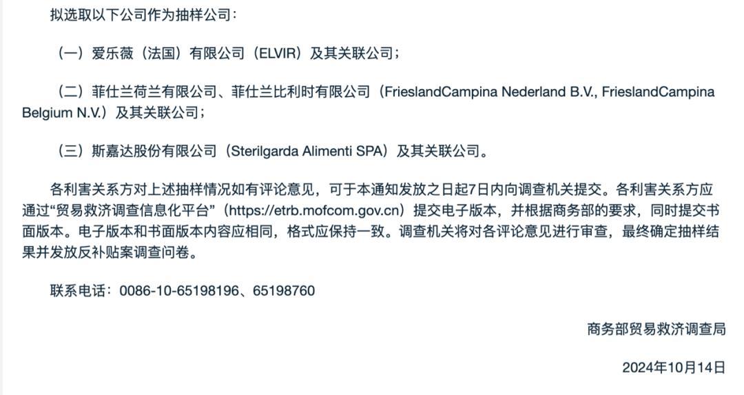 彼时,我国商务部在下属网站上发布声明,宣布菲仕兰与法国爱乐薇(Elvir)公司及意大利斯嘉达(Sterilgarda Alimenti)成为此次反倾销调查的样本企业。这一调查是中国自8月启动的反倾销调查的一部分,针对欧盟乳制品出口商涉嫌向中国倾销产品的问题。