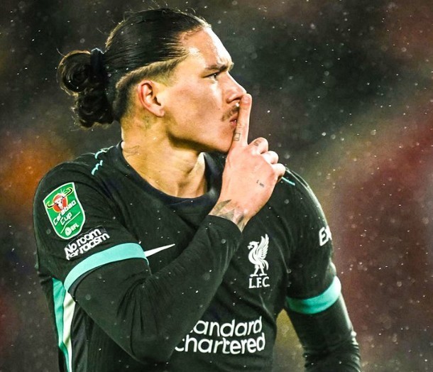 联赛杯1/4决赛,利物浦客场2-1击败南安普顿,晋级四强,红军中锋努涅斯单刀破门。