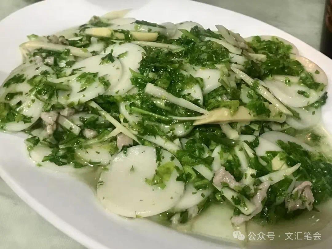 ◆ 雪菜笋丝炒年糕——雪菜和笋丝,和什么都能共炒。宁波人的调味料中最常的,是腌得黄黄的雪菜。烧黄鱼用它,炒黄豆芽也用它,炒毛豆也用它,雪菜百叶也是它。煨面其实用的是雪菜的咸鲜来煨。另外,宁波人调味,也爱用黄酒。我妈还用公卖局出的“红露酒”。