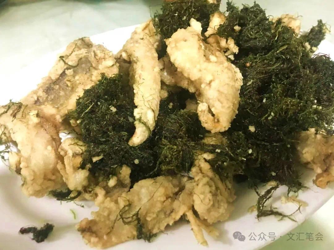 ◆ 苔条拖黄鱼——如今没黄鱼,或许换成马头鱼,或黑鯸。这种把生的鱼肉剔剥下来,一小块一小块的,拖上薄薄的面衣(面糊上已沾上碎碎的海苔丝),入油锅炸,炸好后,蘸醋或不蘸,皆好吃。