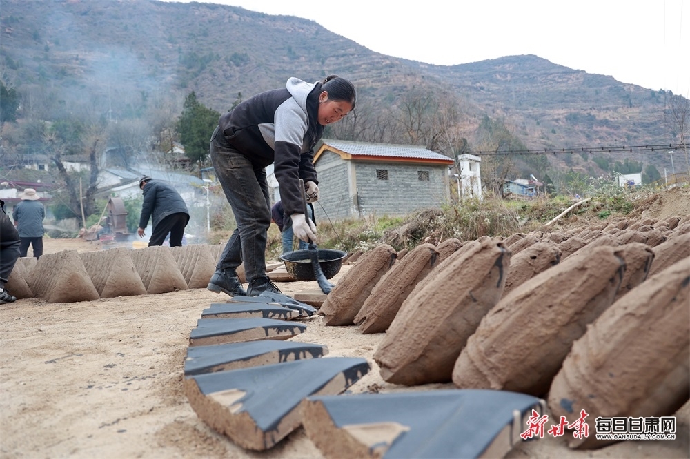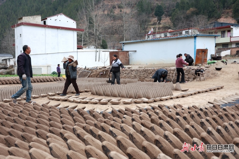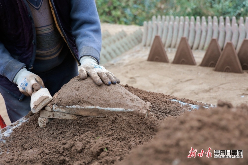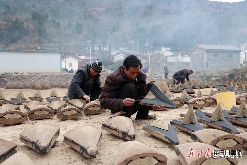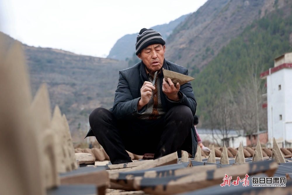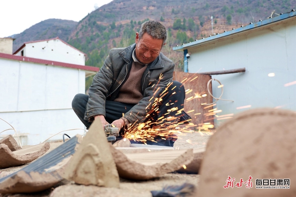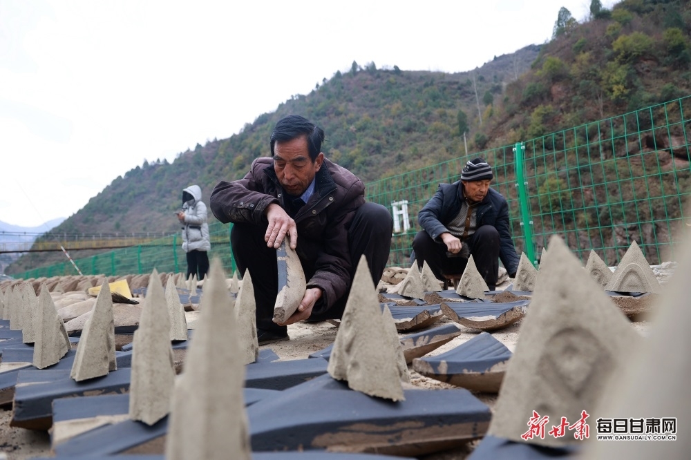 12月8日,在陇南市康县太石乡雍坝村,村民们正在用传统工艺制作铸铧模具。