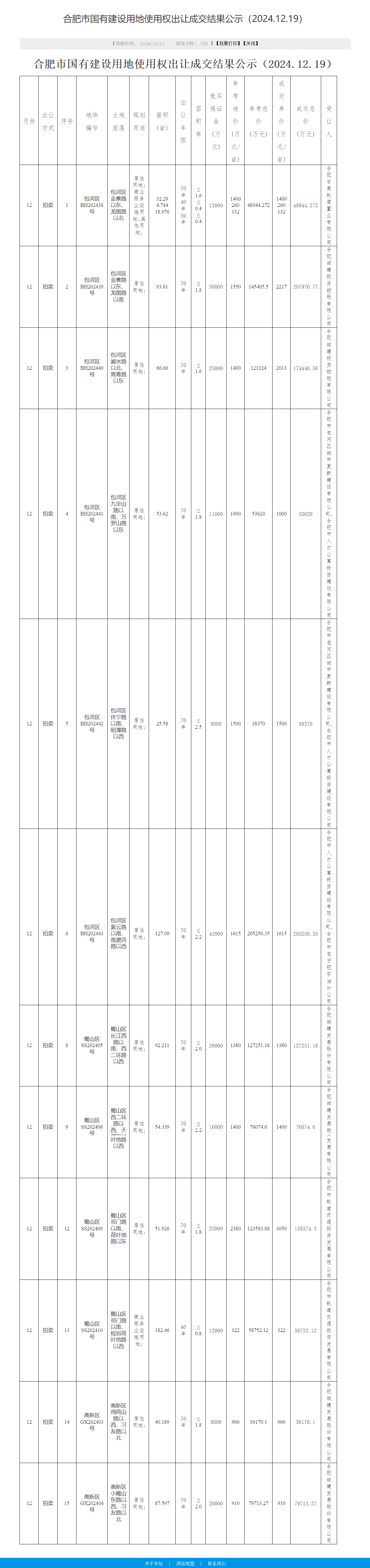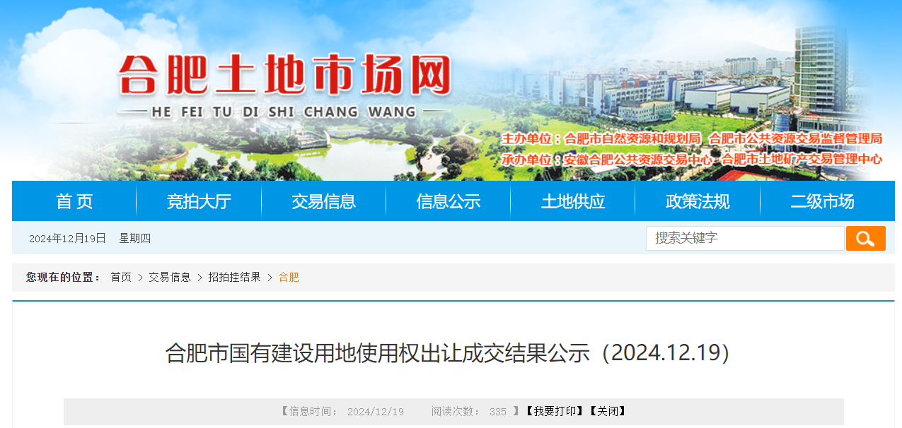 与此同时,12月19日晚间,合肥城建发布公告,通过竞拍方式取得合肥市蜀山区SS202405号地块、合肥市蜀山区SS202406号地块、合肥市高新区GX202403号地块以及合肥市高新区GX202404号地块。四块土地使用权,规划用途均为居住,出让总额为31.92亿元,由公司自筹资金解决。