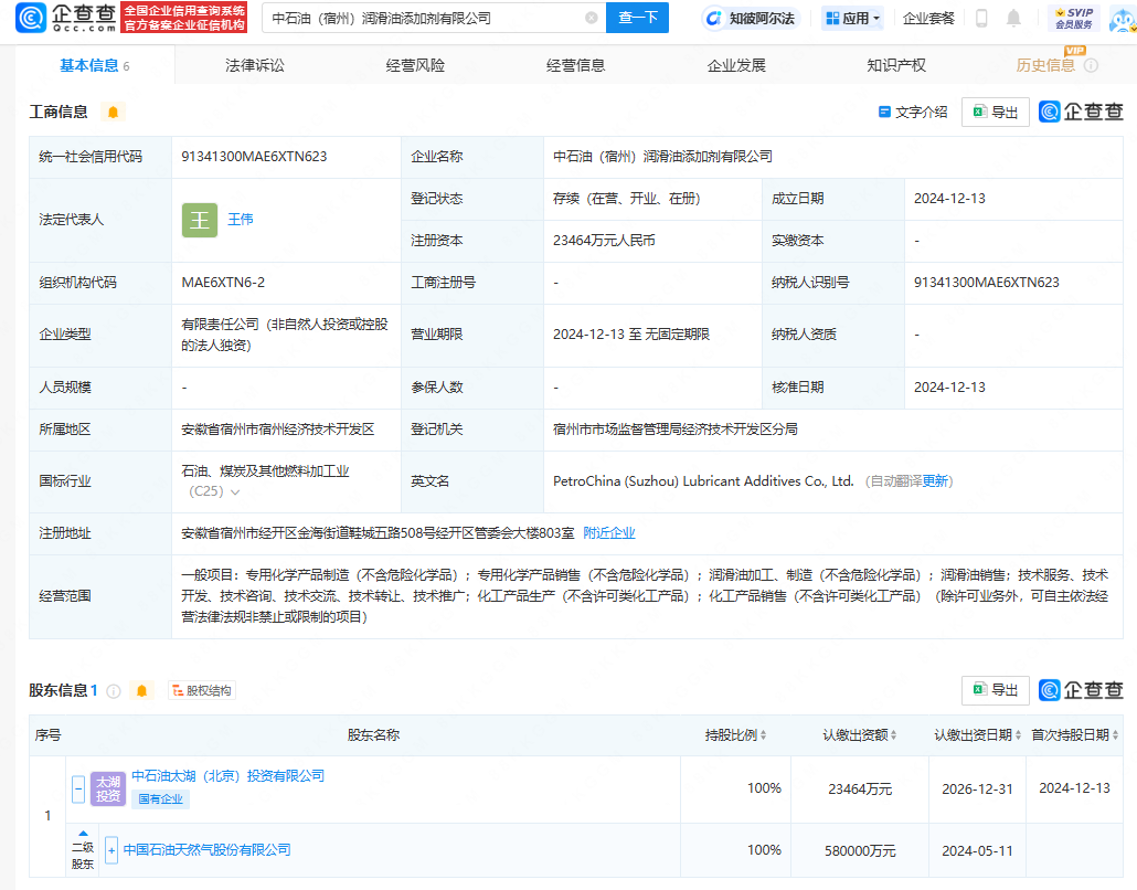 企查查APP显示,近日,中石油(宿州)润滑油添加剂有限公司成立,法定代表人为王伟,注册资本约2.35亿人民币,经营范围含专用化学产品制造,专用化学产品销售,润滑油加工、制造,润滑油销售,化工产品生产,化工产品销售等。企查查股权穿透显示,该公司由中国石油(601857)间接全资持股。