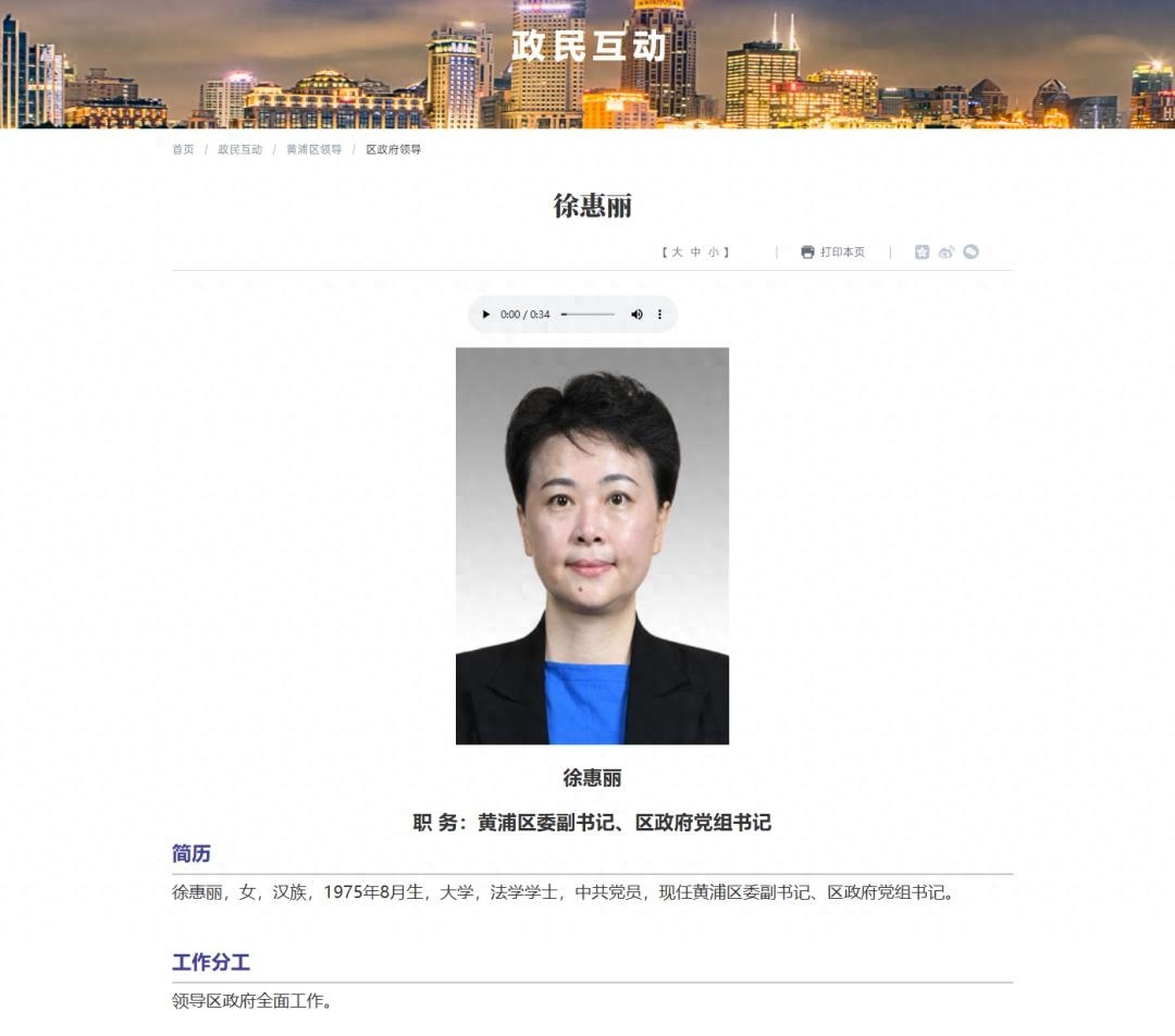据澎湃新闻报道,徐惠丽已出任上海黄浦区委副书记、区政府党组书记。