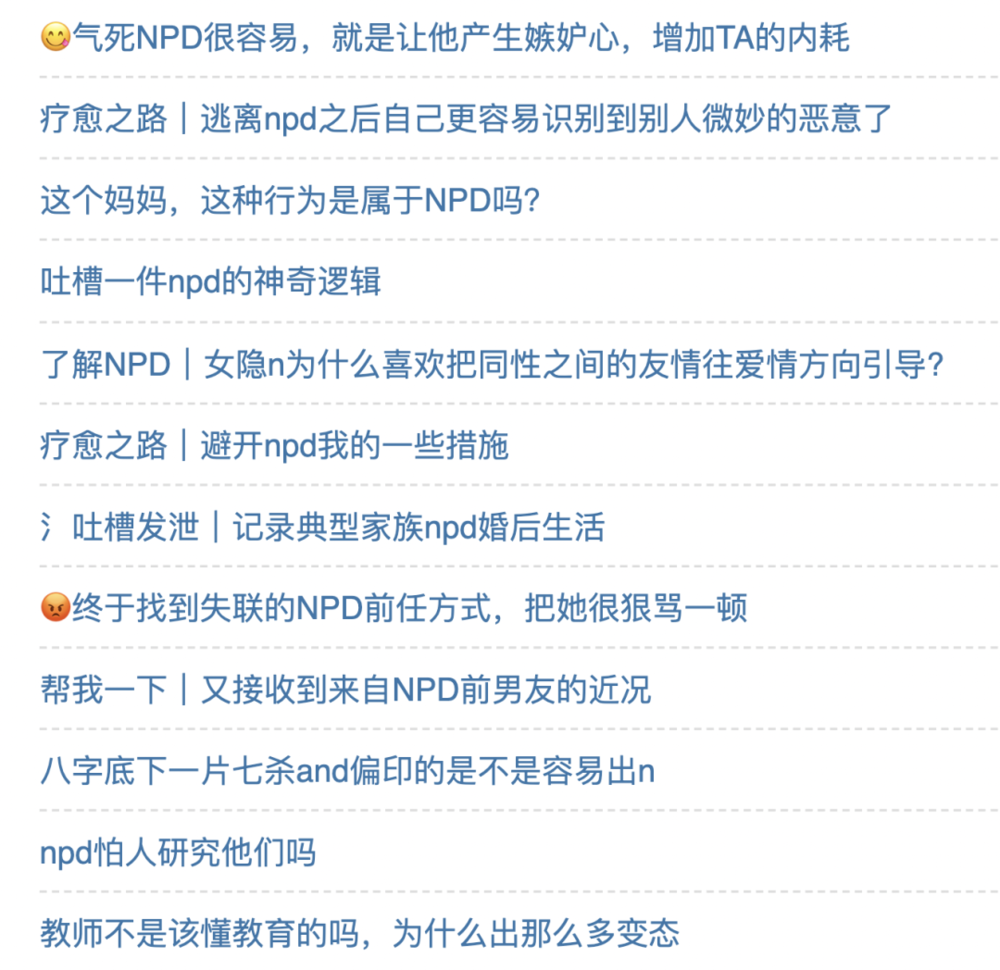 仿佛遇事不顺,全部归咎于对方是 NPD 即可。NPD 这个词在被理解以前,似乎已被污名化与妖魔化。