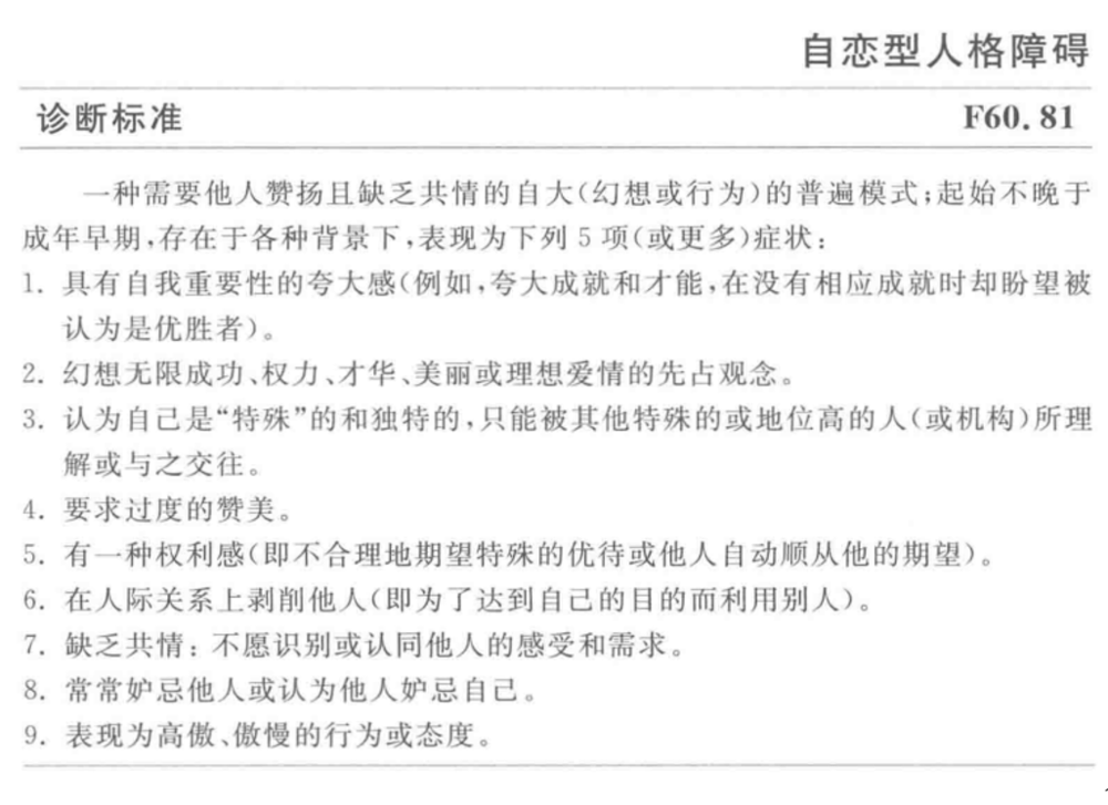 嘎一:NPD,即“自恋型人格障碍(Narcissistic Personality Disorder)”。以下是美国精神医学学会的《精神障碍诊断与统计手册》(以下缩写为 DSM)提供的“自恋型人格障碍”的诊断标准: