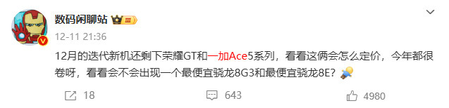 此前,博主 @数码闲聊站 爆料称,一加 Ace 5系列预计是今年价格最低的骁龙8至尊版机型,这也就意味着Ace 5系列定价预计在3500元以内。