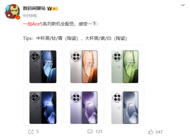 博主 @数码闲聊站 今日还爆料了一加 Ace 5系列的配色和后盖材质: