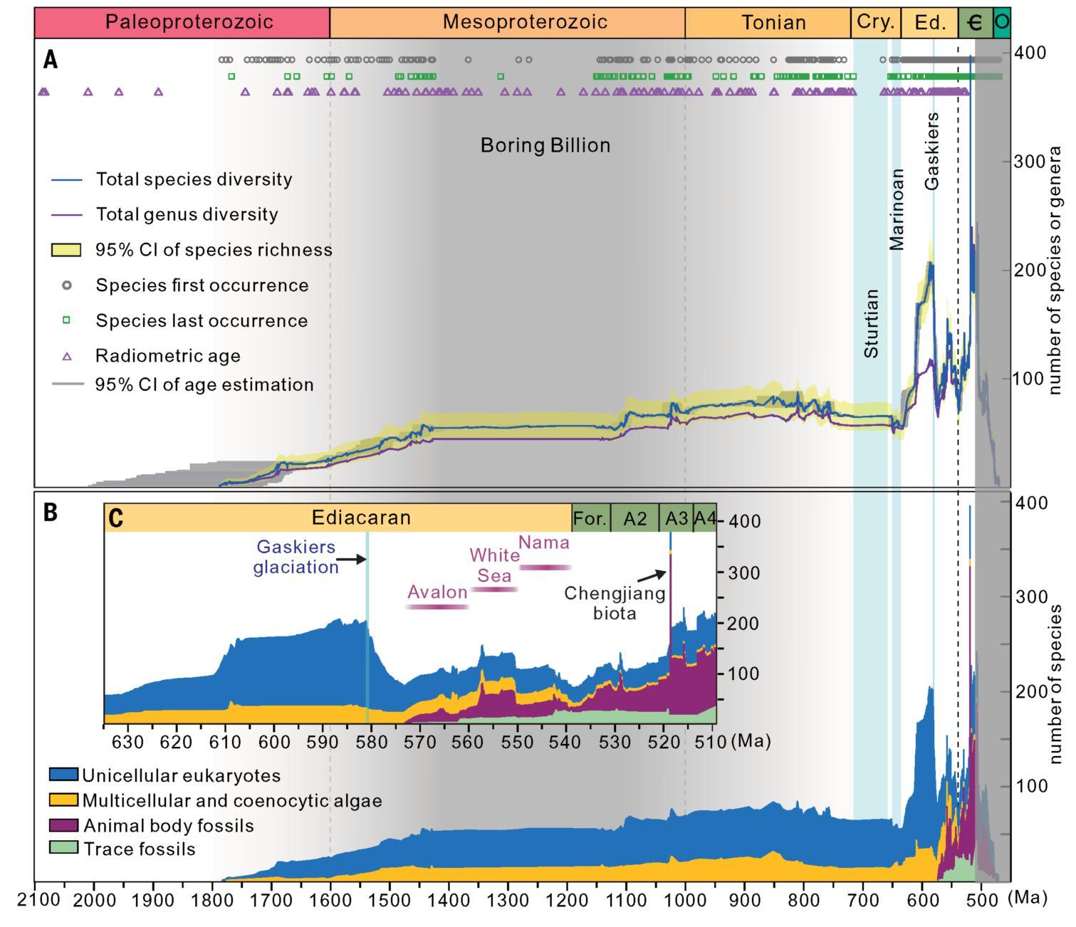 研究结果表明,随着第一个可信的真核生物化石在约17亿年前出现后,其多样性一直保持较低但稳定增长的模式。直到约7.2亿年前全球性大冰期“雪球地球”的出现打断了生命演化的原有进程,导致了生物大灭绝事件出现。此后,地表温度回暖、大气氧含量升高,又促成了新一轮复杂生物大幅射事件的发生。