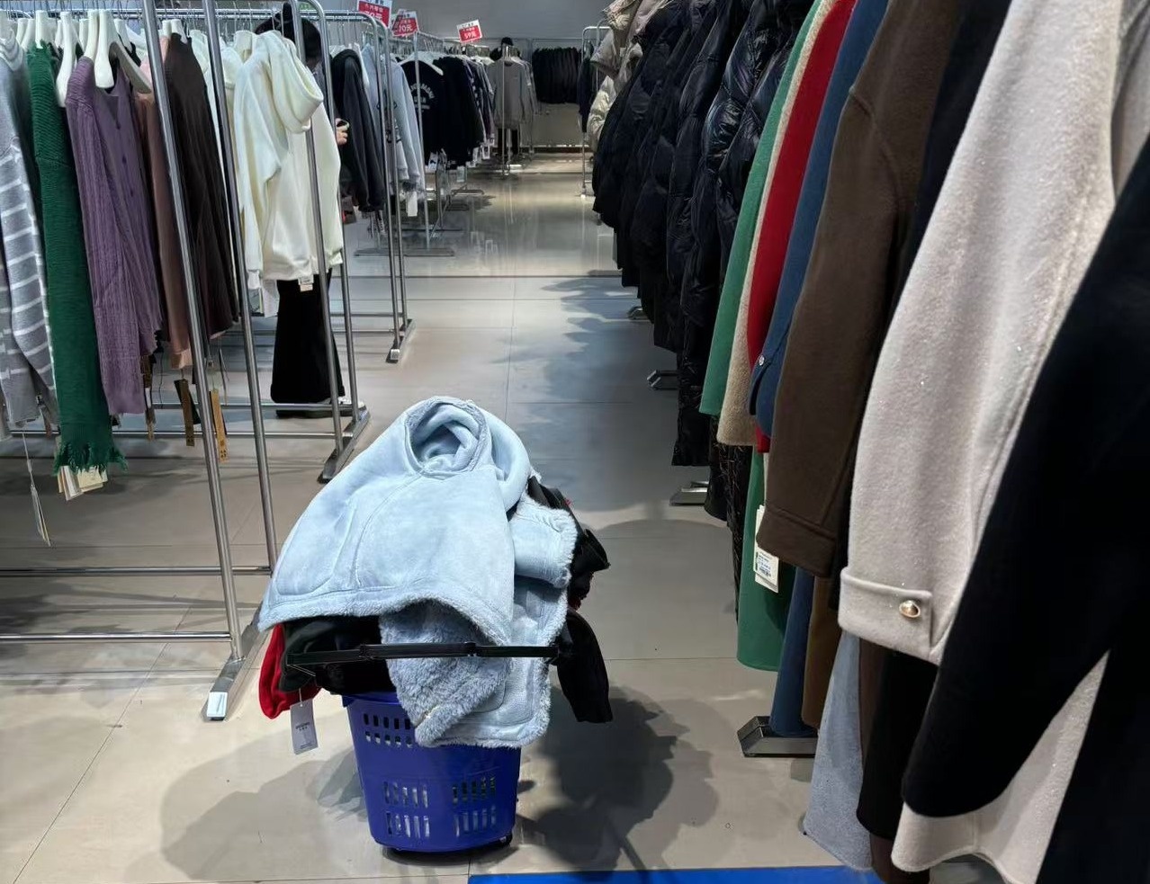 一位顾客装满衣物的购物篮。图/九派新闻记者 阳丹
