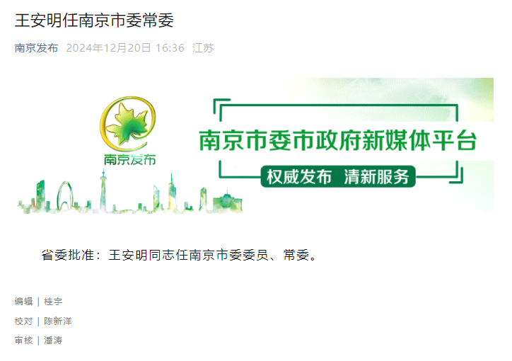 江苏省委批准:王安明同志任南京市委委员、常委。