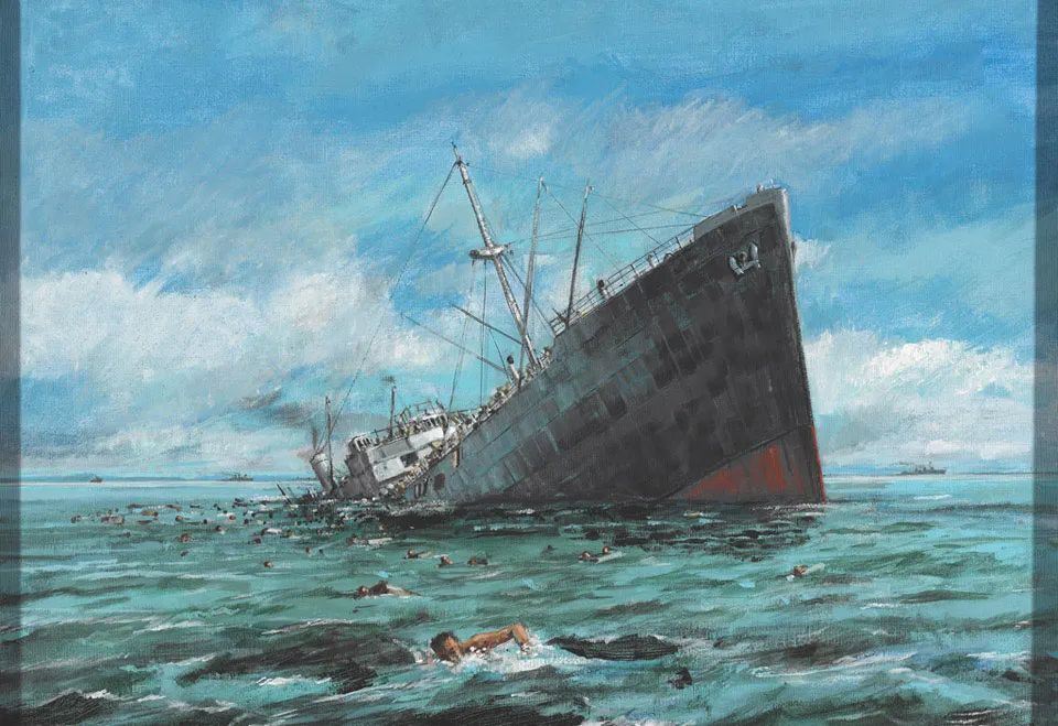 还有一件事,这个我是全部,我采访的这一家人,这个军人叫Billingham,是皇家炮兵的一个士官。他有一个最好的朋友叫Harry Mace,这个Harry Mace是卡在了3号舱顶层的舷窗里面,我从Andrew Salmon的回忆录里面也看到,他画的图有三个英军战俘卡在舷窗那个洞里面,进退不得,因为脑袋挤过去了,肩膀挤出来了,然后盆骨过不去,也退不回去了。好,所以呢,这个Billingham一直陪着Harry Mace,船马上沉没的那一瞬间,他就在身边。当这个船沉过了海面了以后,他看着Harry Mace沉下去,他吸了一口气,一猛子扎下去,握着他的手,也就是在水下生死告别的。哇,这个太惨烈了。