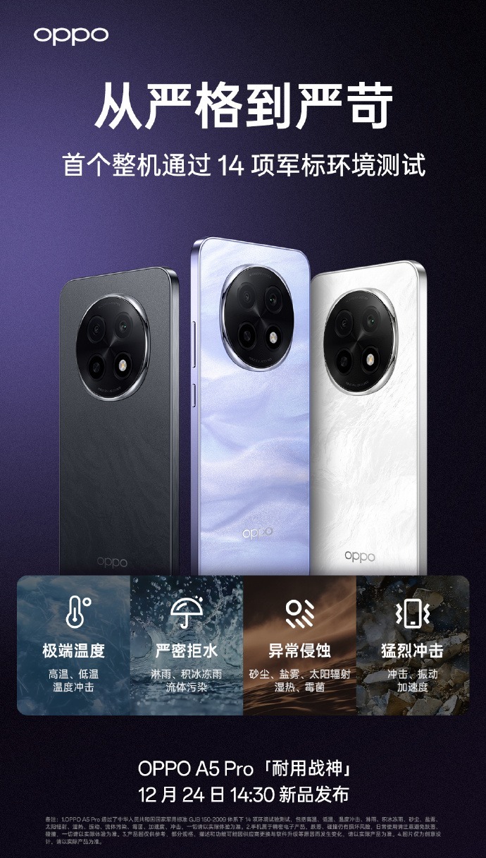 「耐用战神」OPPO A5 Pro整机通过14项国家军用标准测试,能扛得住极端温度,高温、低温和温度冲击;在积雨、积冰。冻雨和流体污染下,OPPO A5 Pro依旧能保持严密拒水;砂尘、盐雾、太阳辐射、湿热、霉菌等异常侵蚀,OPPO A5 Pro也能轻松驾驭;冲击、振动、加速度等猛烈冲击下,OPPO A5 Pro仍然保持完好。