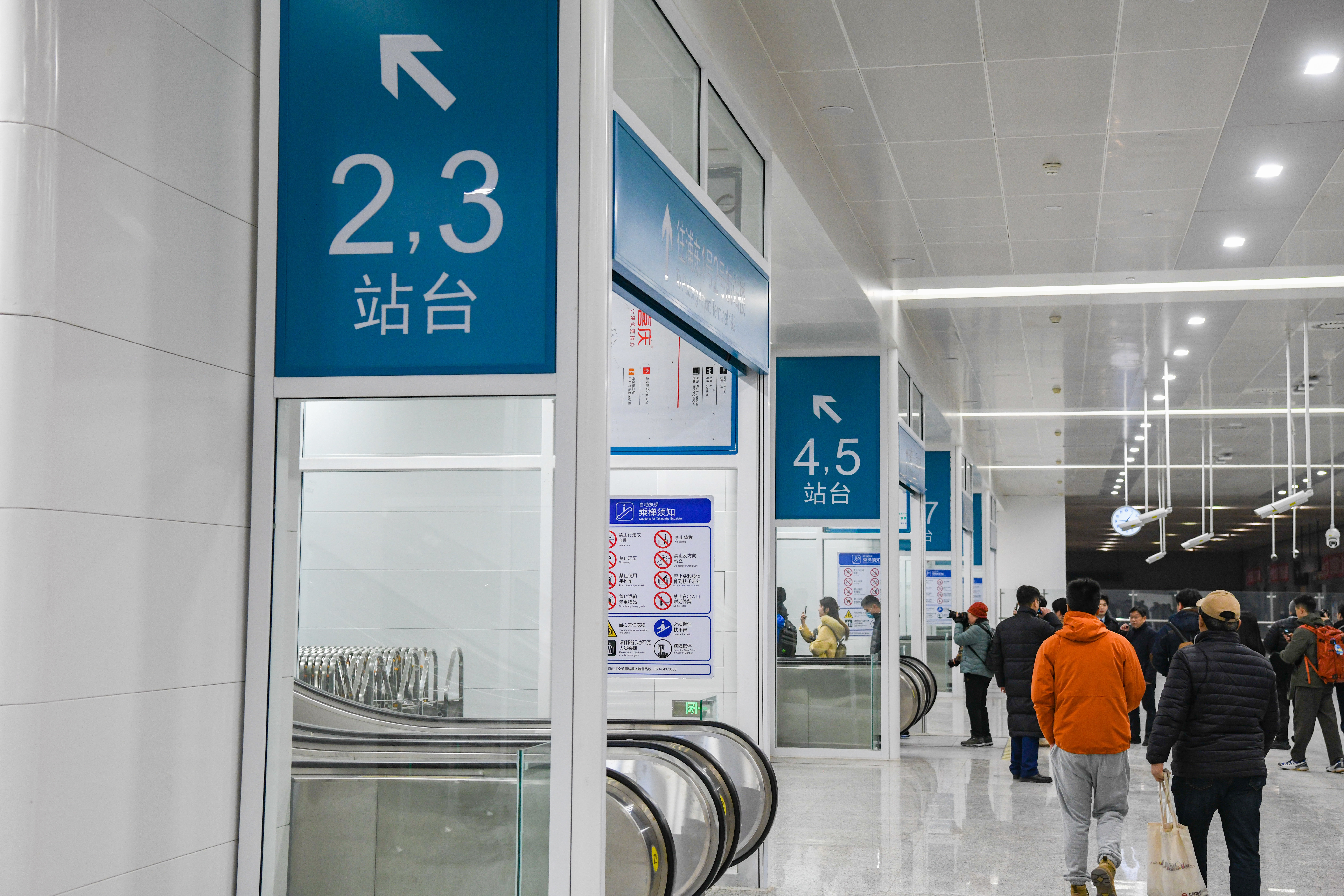 乘客通过闸机之后,从4、5号站台坐扶梯至站厅层。该站的设计灵感来源于高铁列车及轨道,与交通枢纽其他区域保持整体协调。站厅层局部改造设计,采用既有天花的材质、规格、颜色,保持既有整个站厅层风格统一。同时采用“平行线”设计元素,区别其他区域功能。