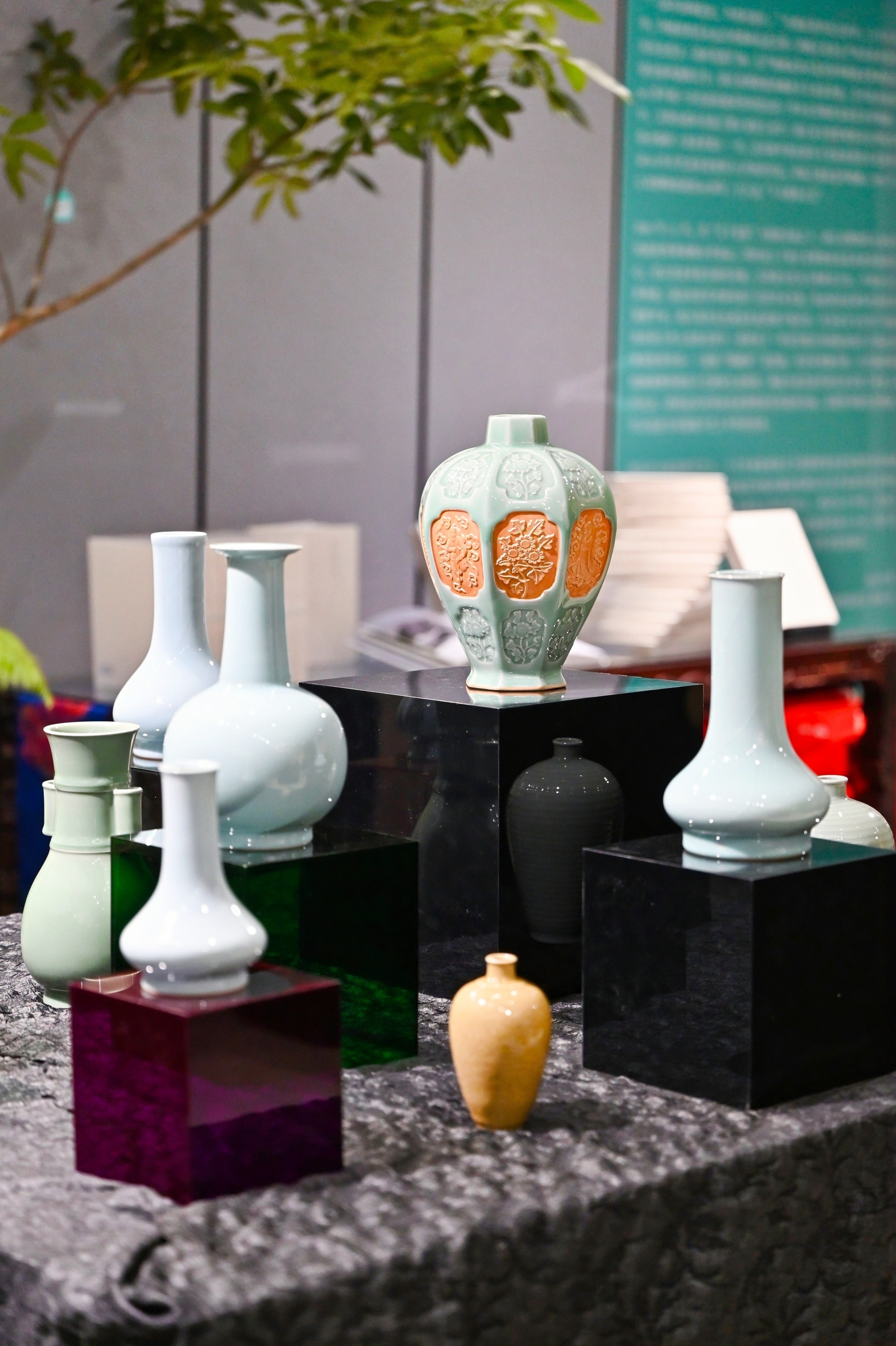 在实体书店看艺术展是什么体验?走进前不久焕新升级的新华博库书城,《合以求良》新书20日首发,“合以求良青瓷器物展”同期展出。