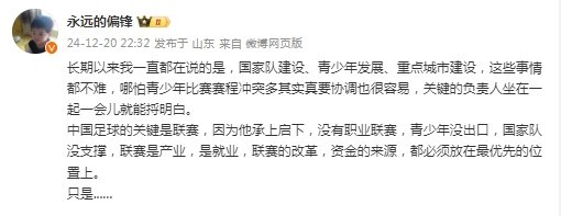 随后,该记者还写道:“长期以来我一直都在说的是,国家队建设、青少年发展、重点城市建设,这些事情都不难,哪怕青少年比赛赛程冲突多其实真要协调也很容易,关键的负责人坐在一起一会儿就能捋明白。”