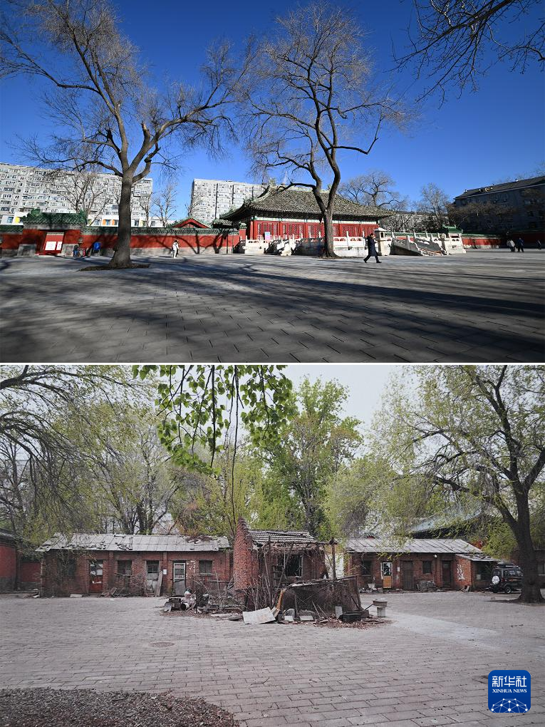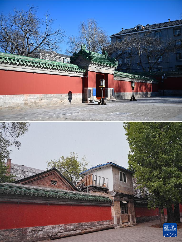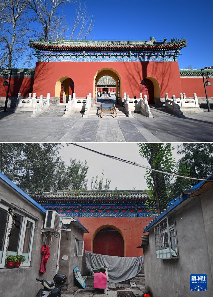拼版照片:上图为腾退修缮后的庆成宫内宫门;下图为翻拍的庆成宫内宫门腾退修缮前的资料照片(12月21日摄)。新华社记者 陈钟昊 摄
