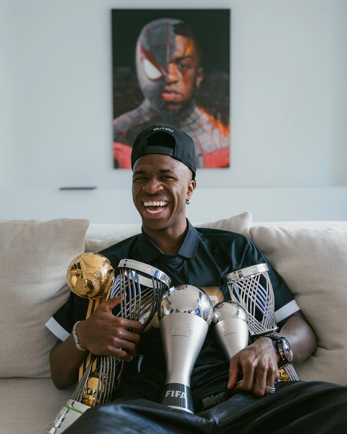 维尼修斯的摄影师在社交媒体发布了维尼修斯与本周收获的五座个人奖杯的合影。