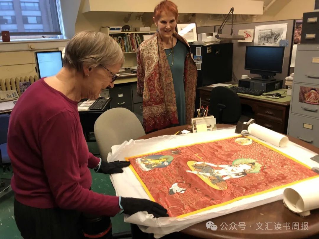 ▲美国自然历史博物馆工作人员接收伦措的唐卡(本书作者摄于2019年)