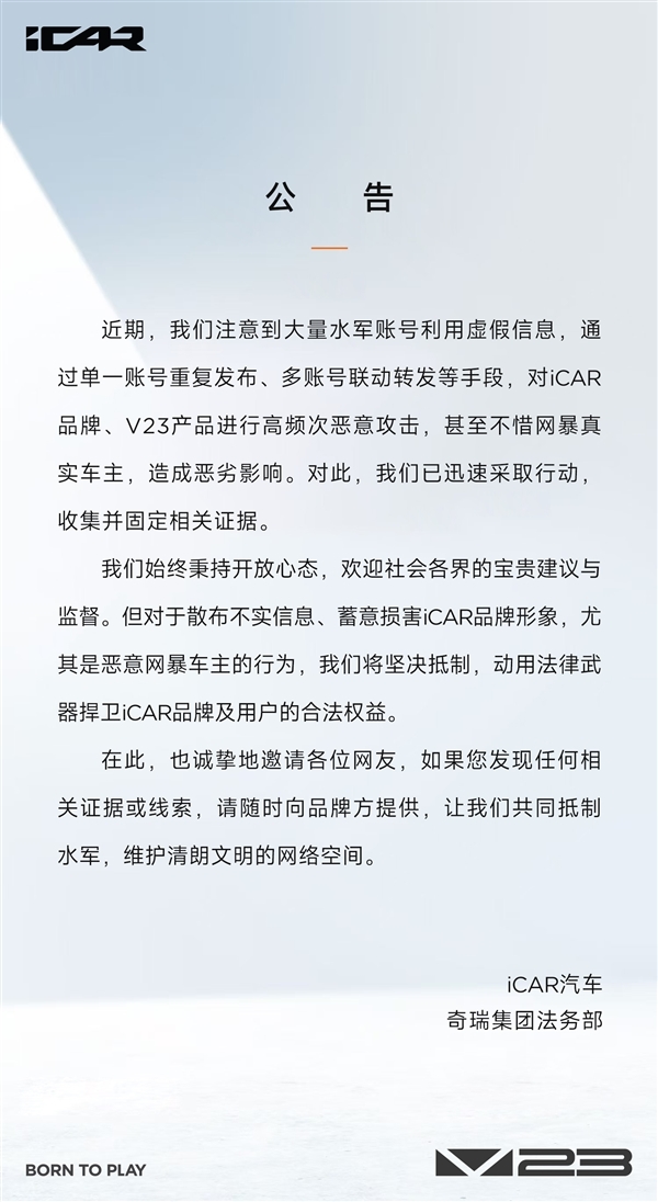 但对于散布不实信息、蓄意损害iCAR品牌形象,尤其是恶意网暴车主的行为,我们将坚决抵制,动用法律武器捍卫iCAR品牌及用户的合法权益。