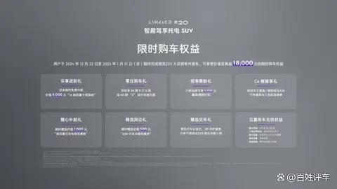 为回馈广大用户支持,领克Z20推出多重购车权益,在 2024年 12月22日至2025年1月31日(含)期间完成领克Z20 大定锁单并提车,可享受价值至高超18,0OO元的限时购车权益。