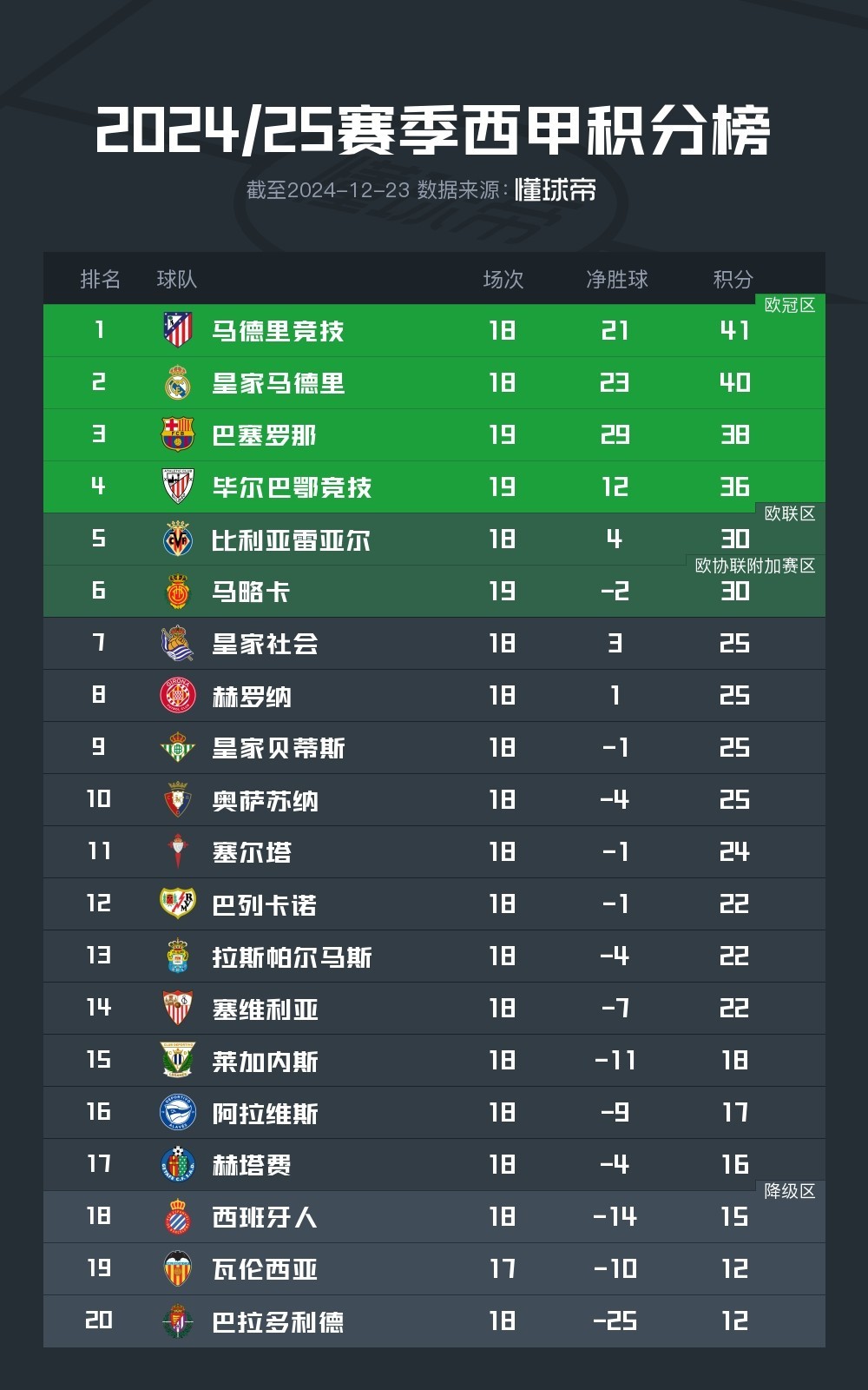 北京时间12月23日,2024/25赛季西甲联赛结束了第18轮的全部较量,积分榜的形势也产生了进一步的变化。