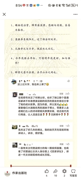 何楚涵回忆起自己最初制作的十条视频,“现在回头看看,讲述苏轼、杜甫、李叔同、鲁迅、李清照的那五条视频竟然都成了爆款,我当时也没预料到会这么火,就是跟着感觉走。”她坦言,在众多知识博主和诗词讲解者中,她的内容想要脱颖而出并不容易。“这么多人看我的短视频,我自己也挺惊讶的。”她笑着说。去年她发现自己被网友们冠以“最会讲故事的女博士”称号,才意识到,原来跟自己会讲故事有关。