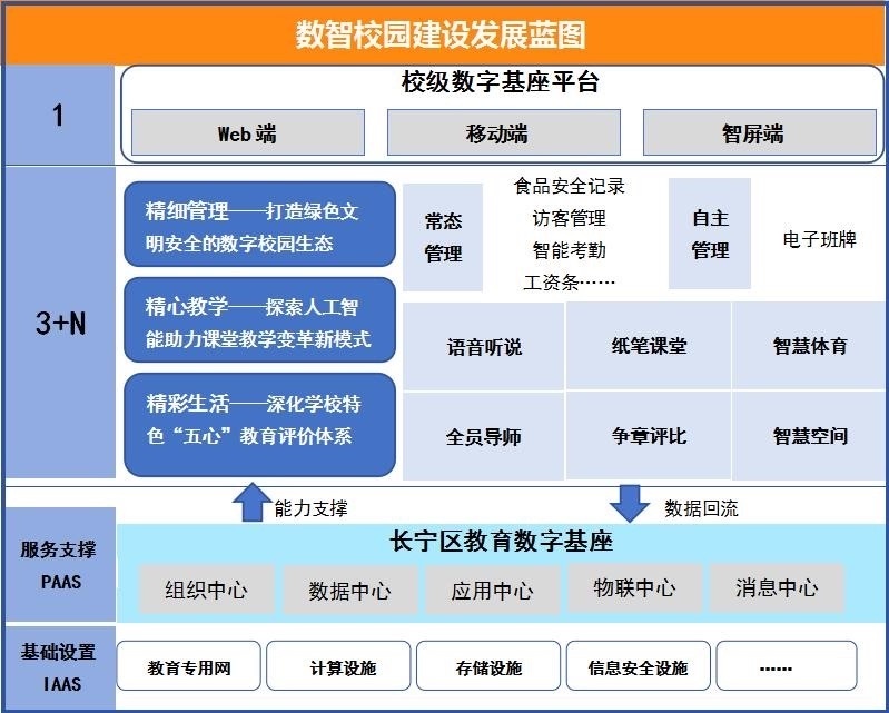 近年来,长宁区玉屏南路小学以“精细管理、精心教学、精彩生活”为愿景,积极构建以人为本的数智校园,探索数字赋能下的校园管理、课堂教学以及学生评价机制优化方案,设计了“1+3+N”的数字化转型发展规划(即1个校级数字基座,精细管理、精心教学、精彩生活3个转型目标,N个应用场景)。