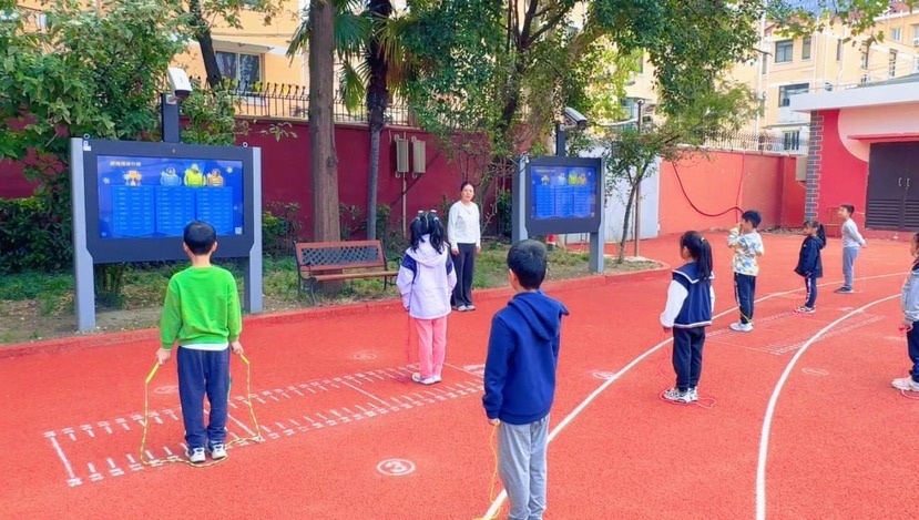 体育测试智慧屏则是体育老师提升教学安全性和有效性的“法宝”。操场上安装的室外体育教学体测屏和室外跑步测试屏,能够辅助教师观察学生动作的标准程度,记录学生的运动数据与成绩。寒假期间,学校通过数字基座中的“智慧体育”应用给学生们布置课外“体育作业”,并将体育锻炼的结果上传至数字基座,家长与老师都能及时了解孩子们的运动情况与身体状态。
