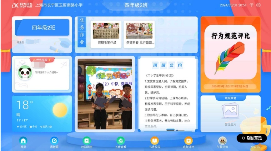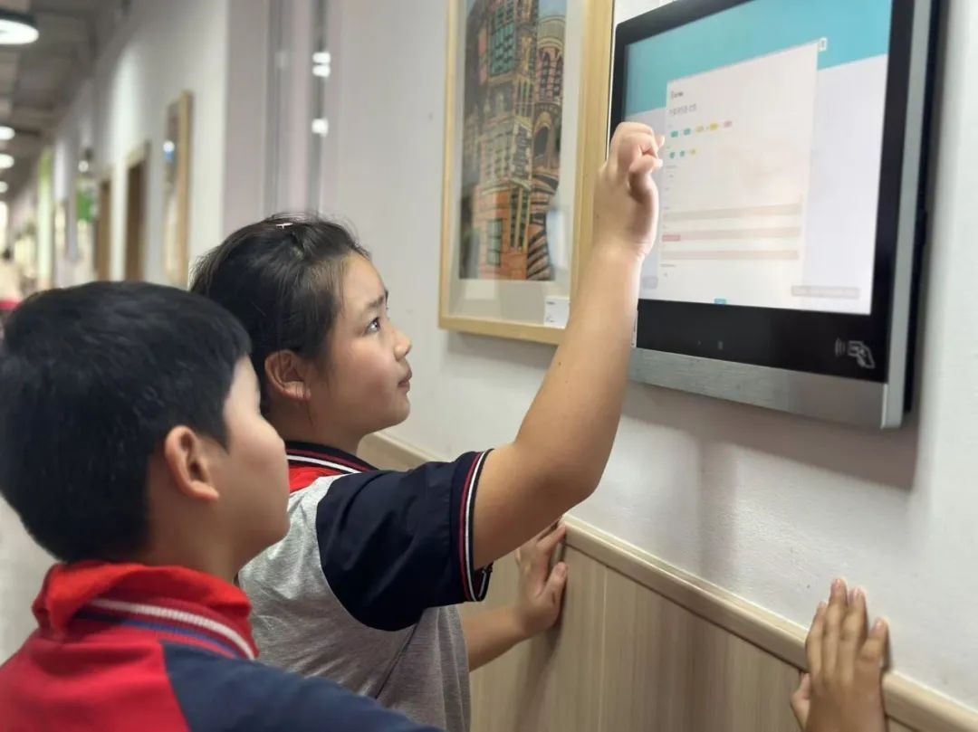 面向学生,学校全校覆盖电子班牌,为孩子们打造了沉浸式的智能化互动式在线空间。风采展示、优秀作业、校园动态……每到下课,孩子们便兴致勃勃地来到这一欢乐角落,点点、看看,乐此不疲。