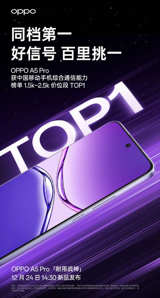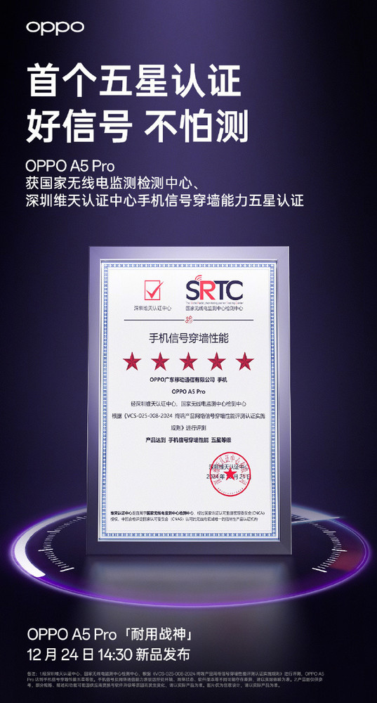 12月23日,OPPO官微宣布,OPPO A5 Pro获得两大权威认证:一个是首个信号穿墙能力五星认证,另一个是中国移动手机综合通信能力1.5k-2.5K价位段TOP1。官方称,OPPO A5 Pro是信号穿墙王,信号能穿十堵墙。今日,官方还OPPO A5 Pro将首发OPPO信号黑科技,行业首创猎手天线架构,中框天线占比更高,不怕墙厚、不怕人多、不怕距离远。