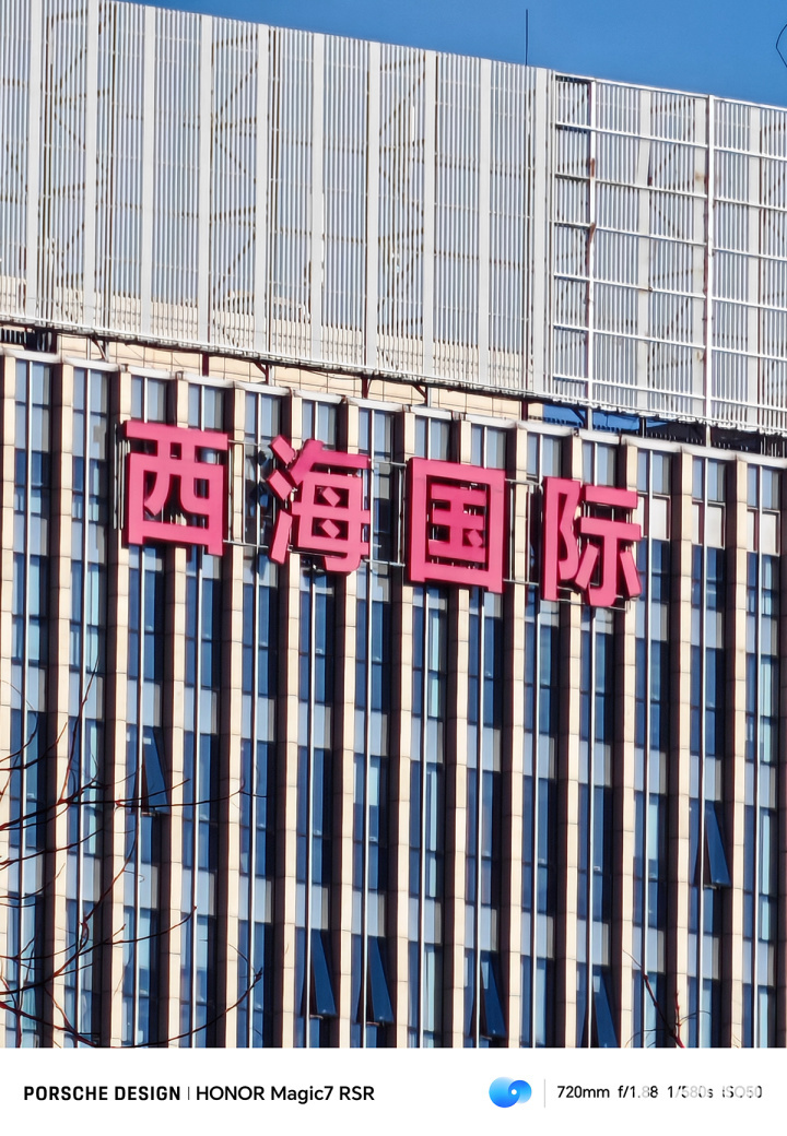 再来看一组荣耀Magic7 RSR 保时捷设计的30倍变焦样张,远处路牌和建筑物广告牌的细节清晰可辨,文字、图案等都能较为清楚地呈现,没有出现明显的模糊或失真现象。此外,荣耀Magic7 RSR 保时捷设计拍摄的路牌和广告牌色彩还原准确自然,与实际场景中的色彩相差无几。这表明该手机的影像系统在长焦拍摄时,能够很好地处理色彩平衡,确保画面色彩的鲜艳度和真实性,使照片更具视觉吸引力。