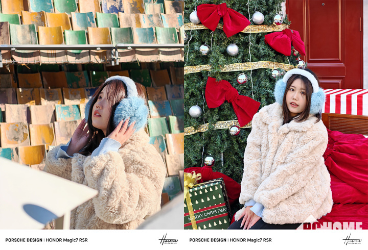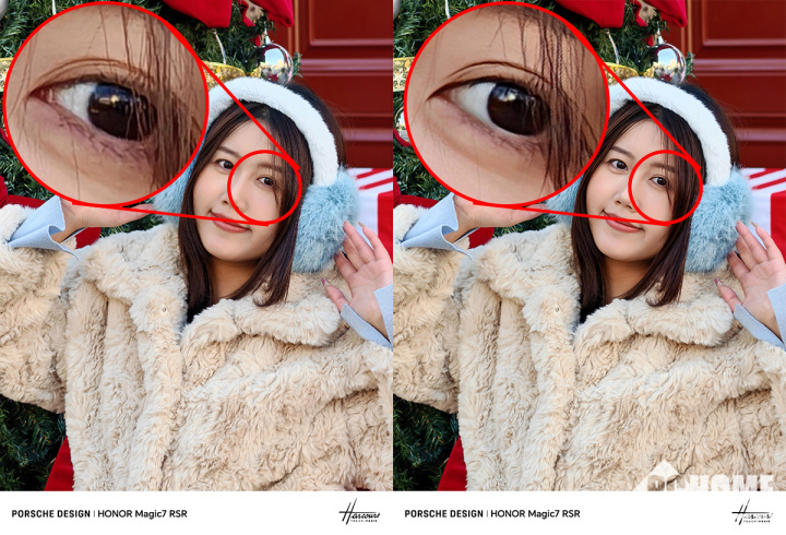 荣耀 Magic7 RSR 保时捷设计关(左)和开(右)AI超清人像功能拍摄人像