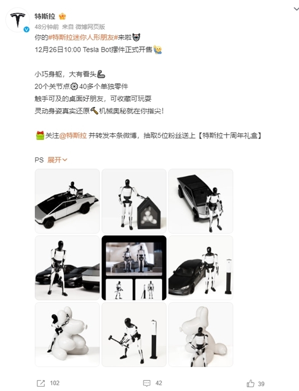 快科技12月23日消息,特斯拉官方宣布,其最新产品Tesla Bot摆件将于12月26日上午10点正式对外发售,官网定价为199元。