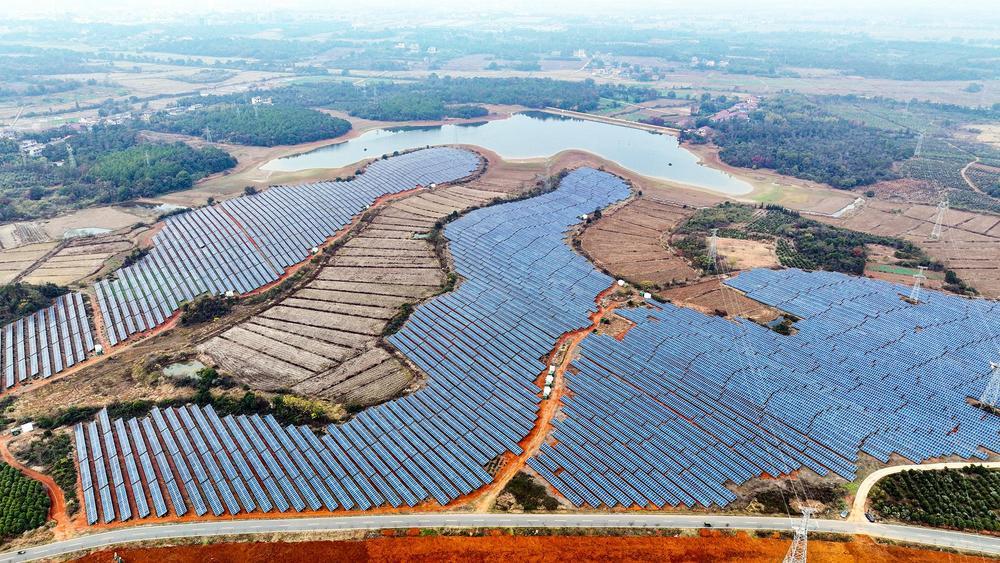 近日,航拍下的奉新县宋埠镇锁石村与东垦场罗塘分场一带的光伏发电基地,与青山绿水交相辉映。近年来,该县积极利用水库、滩涂草地和山坡资源,大力发展光伏发电产业,在实现节能减排、绿色发展的同时,带动群众增收,为乡村全面振兴注入新的活力。(邓建刚 涂克琴 摄)