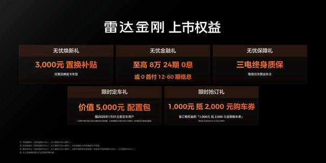 本次发布会,吉利雷达还推出了专属上市权益,包括三电终身质保、至高8万24期免息(或0首付12-60期低息)、3000元置换补贴的无忧三重礼(置换补贴与金融贴息二选一),以及还有价值5000元的限时定车礼、1000元抵2000元的限时抢订礼。