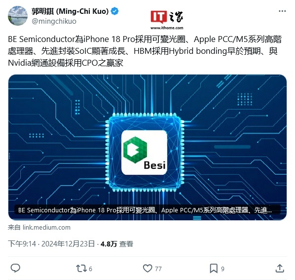 郭明錤透露,荷兰制造商贝思半导体(BE Semiconductor)将为 iPhone 18 Pro 提供光圈叶片组装设备,IT之家注:光圈叶片是控制光线通过镜头的机械部件。