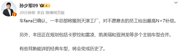 12月24日,据车fans创始人、汽车博主@孙少军09 爆料,一汽丰田总部将搬到天津工厂,对不愿意去的员工给出最高N+7补偿。同时,丰田正在规划包括卡罗拉和雷凌、凯美瑞和亚洲龙等多个主销车型合并。他说丰田有些耳熟能详的经典车型,将会变成历史。