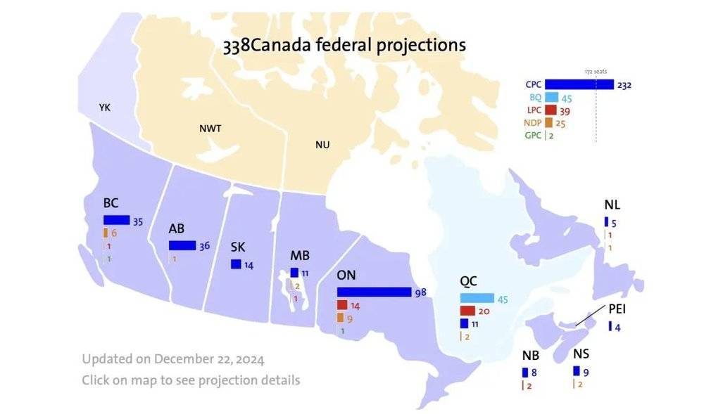 ◆2025年大选选情最新预测,图源:338Canada,截至2024年12月22日