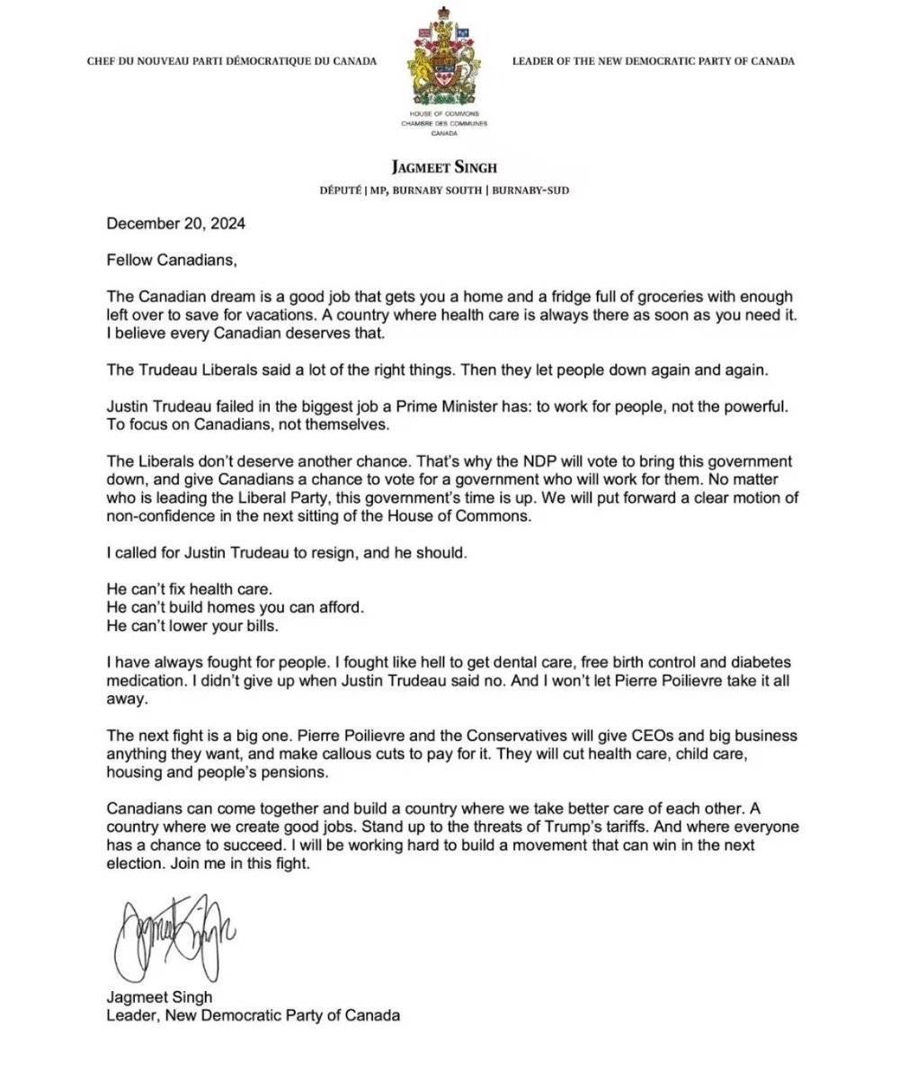 然而今年9月4日,辛格发布视频声明,宣布新民主党单方面退出上述协议,理由是自由党“太虚弱、太自私”,无法为加拿大人而奋斗。彼时,特鲁多的内阁辞职潮和执政团队危机呼之欲出,皮埃尔·普瓦列夫尔(Pierre Poilievre,又译为博励治)领导的最大反对党保守党趁机于9月25日、10月1日、12月9日连续发起三次不信任动议,只是新民主党尚未把事做绝,投票支持特鲁多逃过三劫。