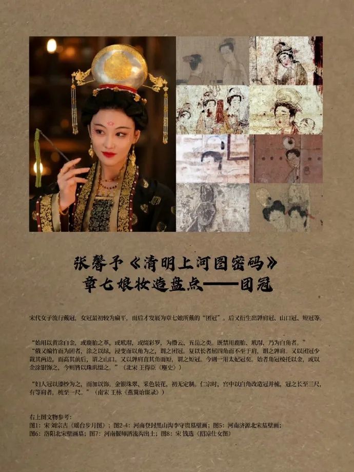 其实张馨予在剧中的造型,就是从“白沙宋墓”的壁画中抠下来的,头上顶的那团冠,就是当时有身份地位的女性的日常造型。