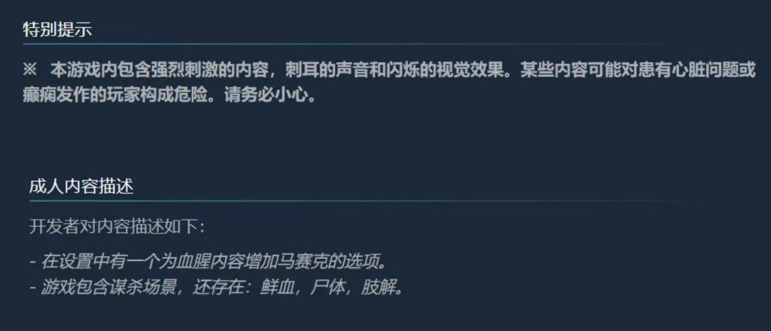 也只有在“特别提示”与“成人内容描述”的只言片语中,玩家才能初窥恐怖要素的冰山一角,主打一个“把人骗进来杀”。
