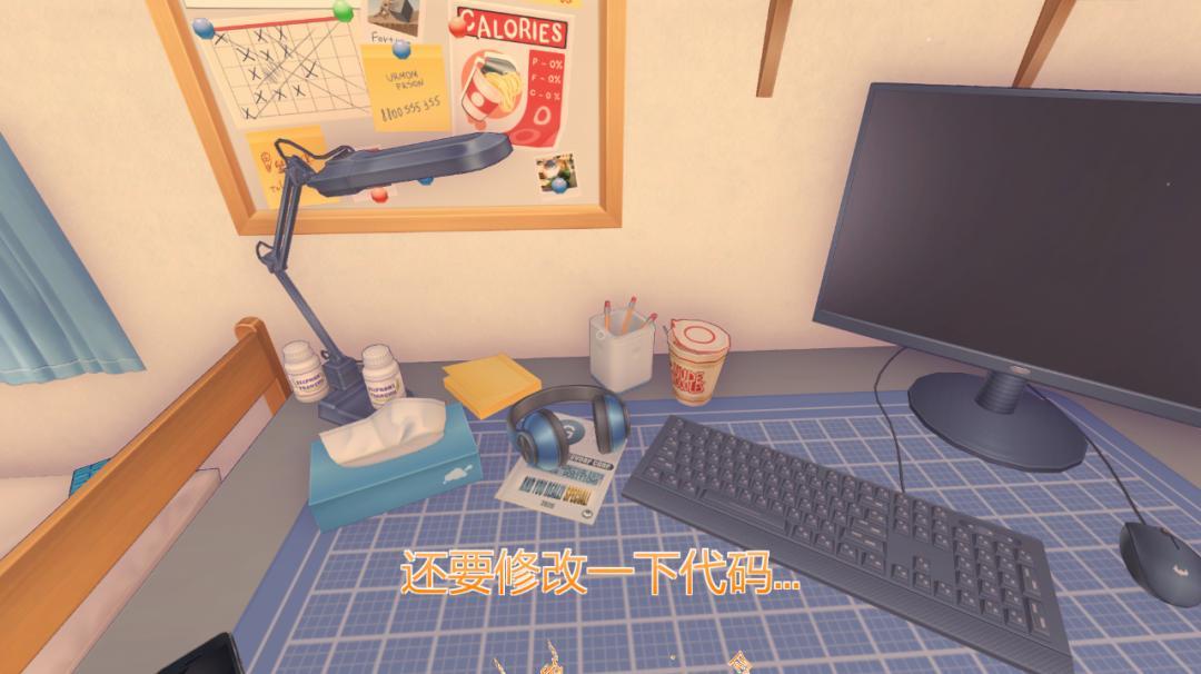 玩家扮演的男主是一位独居的程序员,日复一日地过着单调乏味的生活。随意摆放的衣物、未及时清理的垃圾、桌上的杯面和安定药,无一不在诉说着主人公生活习惯的混乱,或许也暗示了开发者在游戏开发后期爆肝时的精神状态。