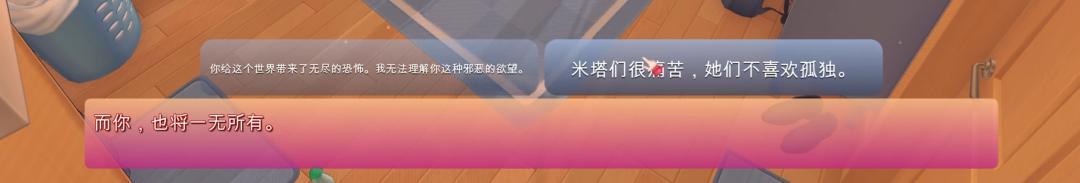 男主是孤独的,米塔们是孤独的,疯狂米塔虽然性格又病态又混沌,但她疯狂的本因,也可以解构成对孤独的排斥。残酷的是,游戏目前并未给予玩家一个留下来陪伴米塔们的机会。玩家在竭尽所能后,最终只能空留得一身无力感。