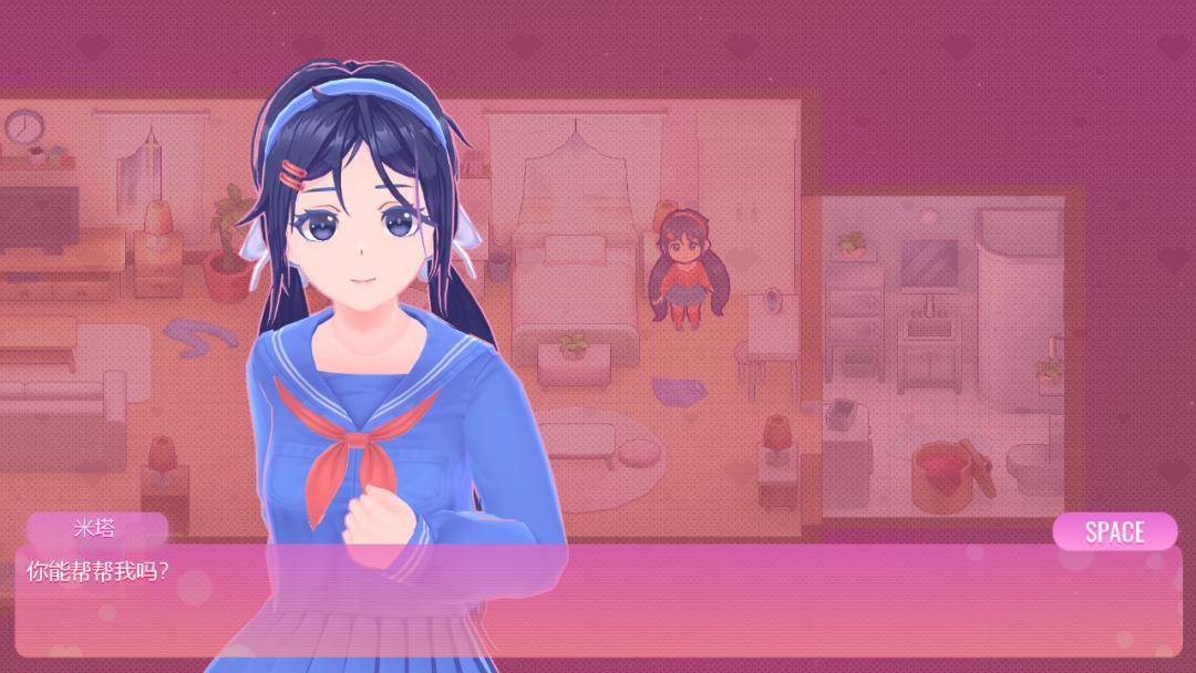 然而,这一切都在遇到「米塔」后发生了翻天覆地的变化。米塔是恋爱模拟手游《米塔》中的虚拟角色,在对话框与玩家交流时,呈现为等比例3D建模的美少女形象;在模拟玩法界面,则化身为生活在三室一厅的Q版三头身小人。
