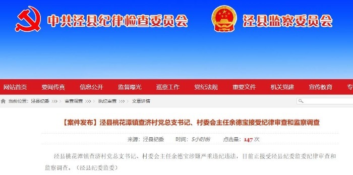 泾县桃花潭镇查济村党总支书记、村委会主任余德宝涉嫌严重违纪违法,目前正接受泾县纪委监委纪律审查和监察调查。(泾县纪委监委)