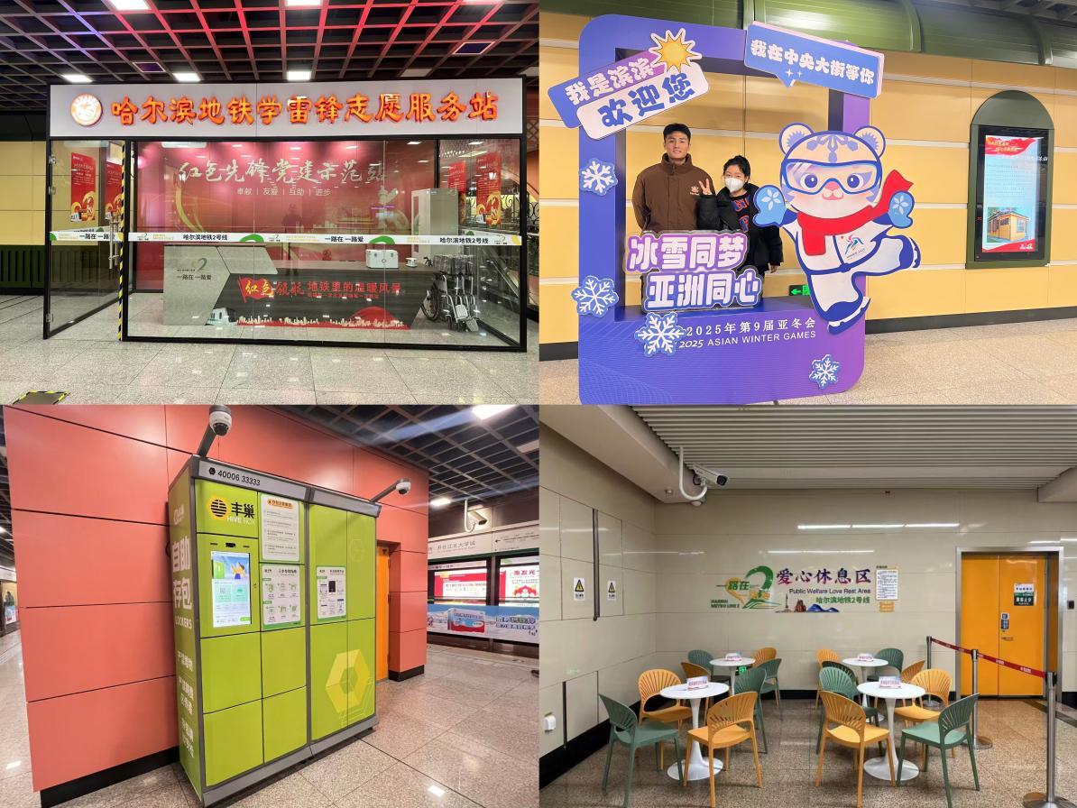 为让乘客体验便捷出行,感受地铁服务的贴心与关怀,在线网重点旅游车站增设了“多语种翻译中心”、配置翻译机,实现与外籍乘客无障碍交流;为方便游客寄存包裹,在博物馆站、太阳岛站、中央大街站、哈尔滨站、冰雪大世界站等线网重点车站增设智能存储柜30处;在大客流车站增设“便民更衣室”;配置“便民服务卡”,市民持卡不乘车也可免费进站使用卫生间;设置“爱心休息区”“便民指引条”“便民服务台”,提供免费热水、自动售卖机、自动照相机显示屏。