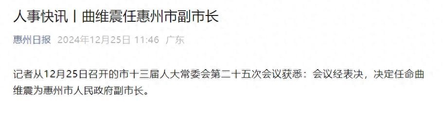 据惠州日报消息,记者从12月25日召开的市十三届人大常委会第二十五次会议获悉:会议经表决,决定任命曲维震为惠州市人民政府副市长。