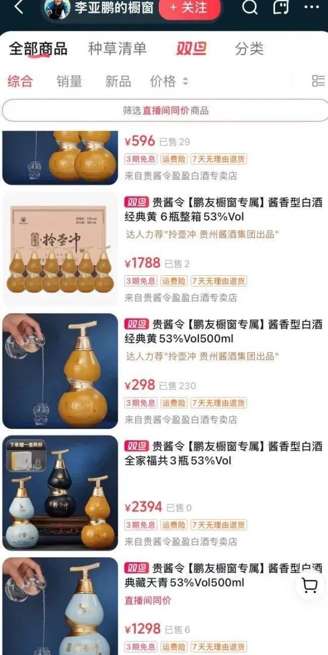 “贵酱令·拎壶冲”的高端白酒系列都是53%vol的酱香型白酒,三款主销产品单价分别为398元、698元和1298元,这个售价除了不及茅台,与市面上的剑南春、五粮液、泸州老窖等老牌白酒的高端线不相伯仲。